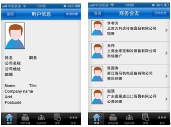 (二)商務會友 掃碼功能不僅能識別產品的二維碼,還可以拍攝參展人員或觀眾胸卡上的條形碼。只需輕輕一拍,便可獲取對方的身份信息,并自動記錄在“商務會友”里,省去交換名片的環節。(見圖3、4)